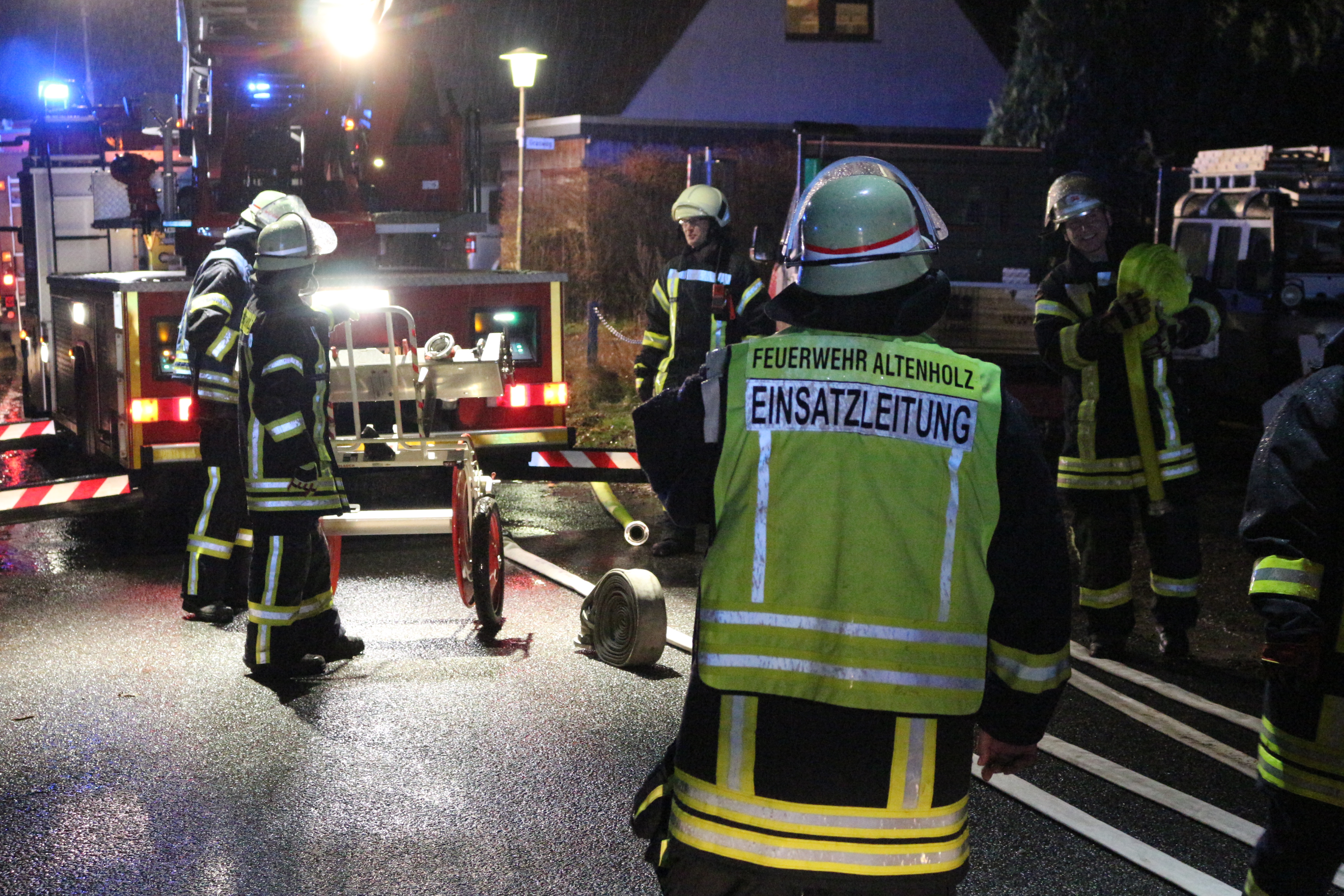 Mit einem wirklichen „Knalleffekt“ endete das Übungsjahr für die Freiwillige Feuerwehr Altenholz: Auf dem Dienstplan für den letzten Übungsdienst des Jahres am 8. Dezember stand eine Fortbildung zum Thema Unwettereinsätze. Anschließend sollte es zum „Abgrillen“ und „Anpunschen“ gehen. Doch kaum waren die 25 Aktiven zur Einteilung angetreten, heulte plötzlich die Sirene auf dem Dach des Gerätehauses. Die Leitstelle meldete ein Feuer in einem Einfamilienhaus im Dehnberg, das bei Renovierungsarbeiten ausgebrochen war. Mehrere Personen sollten sich noch im Gebäude befinden.
