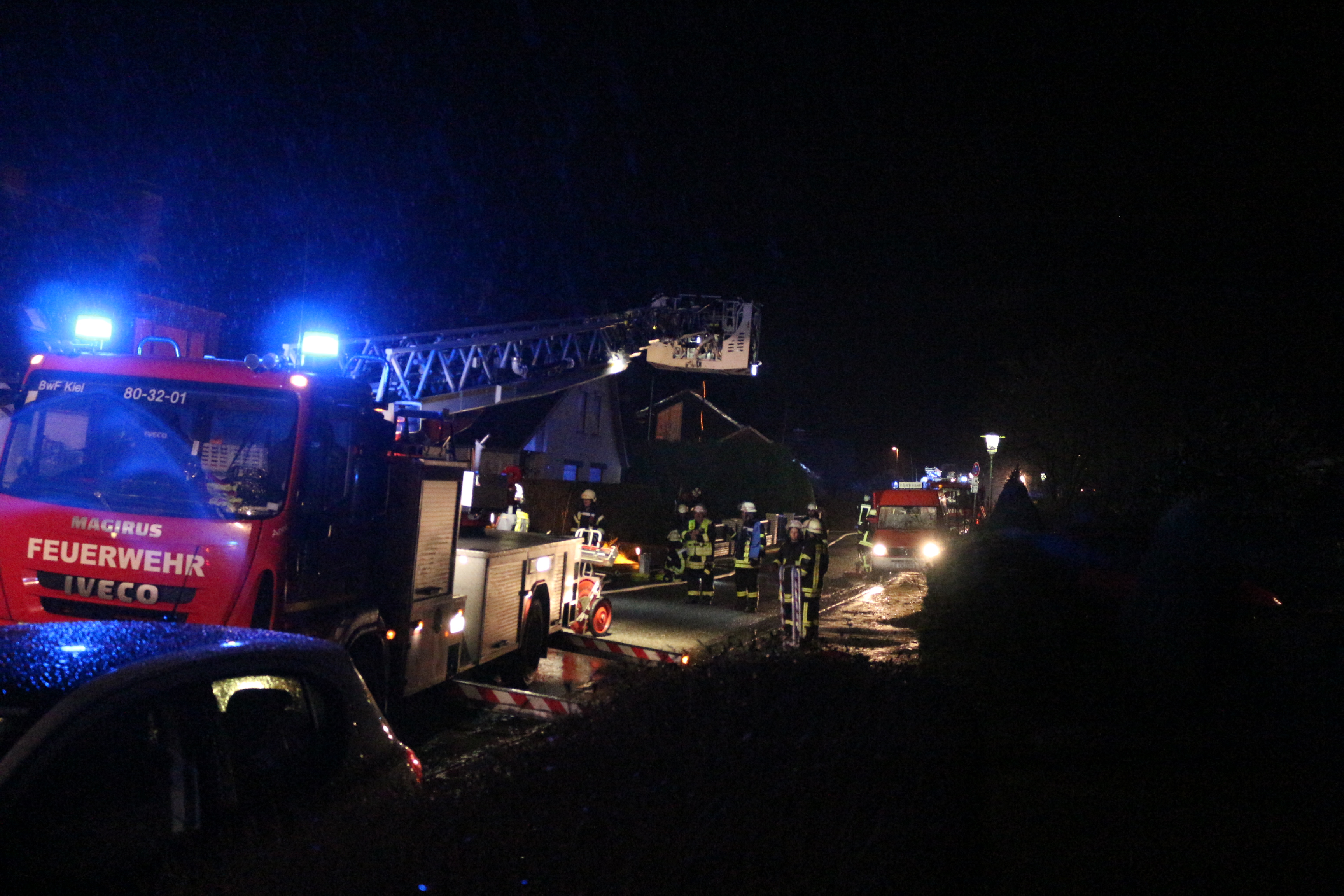 Dementsprechend groß war das alarmierte Kräfteaufgebot: Neben den beiden Ortswehren Altenholz und Knoop wurden auch eine Drehleiter aus Kiel und die medizinische Ersthelfergruppe der Feuerwehr Dänischenhagen in Marsch gesetzt. Vor Ort erwartete die Feuerwehrleute laute Explosionsgeräusche, flackernder Feuerschein und dichte Rauchschwaden. Schemenhaft machten sich Personen am Fenster bemerkbar.