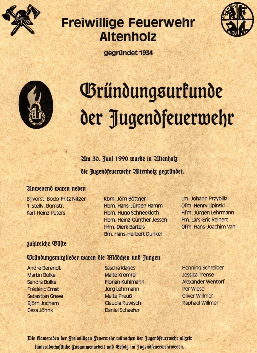 Am 25.09.1989 sind, zum ersten Mal in der Geschichte der FF Altenholz, die Ehefrauen der Kameraden Lipinski, Przybilla und Vahl anwesend. Diese wurden nachhaltig informiert mit der Bitte um eine Entscheidung bis zum 05.11.1989.